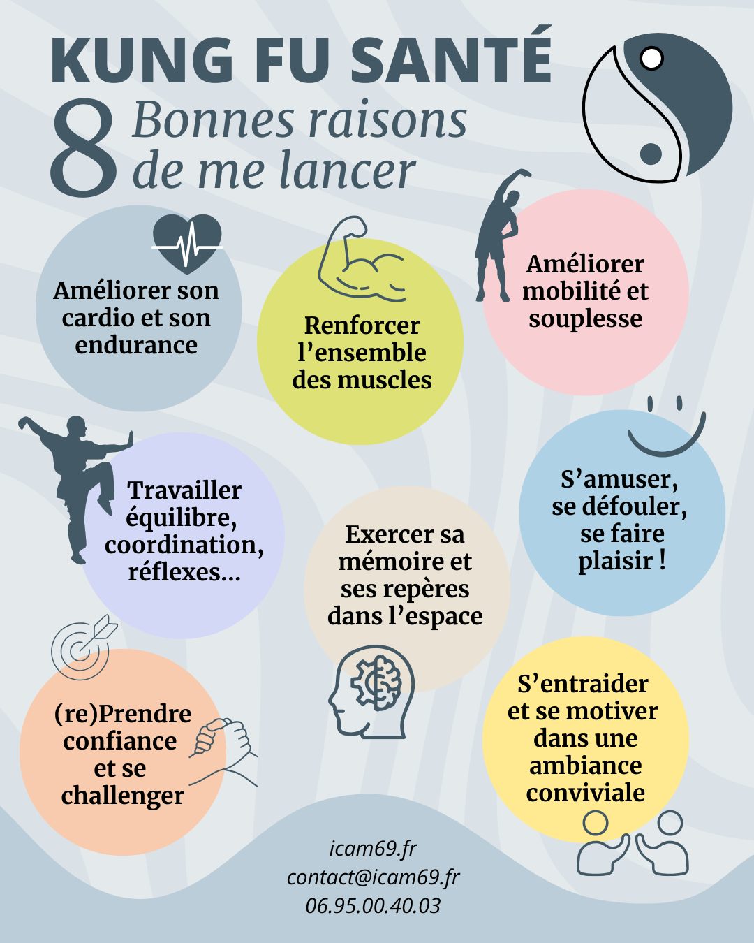 Cours spécialement adapté pour se remettre en forme et maintenir une activité physique, en tenant compte des besoins et capacités de chacun. La pratique du Kung Fu Santé est adaptée à différents profils et pathologies